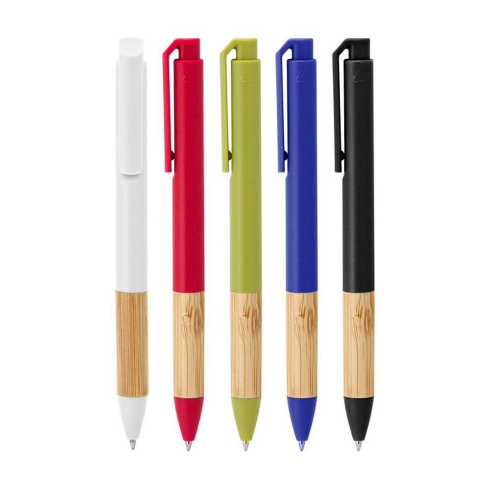 Bolígrafo retráctil. Cuerpo, puntera y pulsador de plástico reciclable. Agarre de bambú. Pintura acabado mate. Medidas: 1,1 x 14,3 cm Materiales: Plástico ABS reciclable y bambú Peso: 8,7 g Tinta: negra.