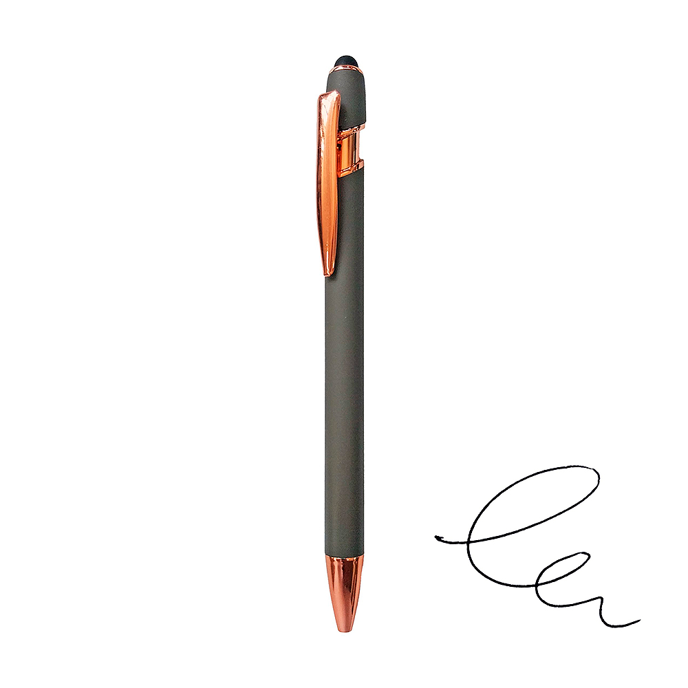 Destaca por su diseño elegante y contemporáneo, combinando un cuerpo metálico engomado en color gris con refinados detalles en tono cobre. Su acabado soft touch aporta una experiencia de escritura cómoda y un alto valor percibido, ideal para entornos corporativos y ejecutivos.