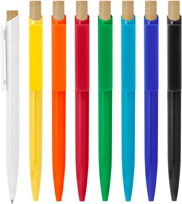 Bolígrafo OBLIK. Bolígrafo retráctil. Cuerpo de diferentes colores. Pulsador de bambú. Clip del mismo color del cuerpo. Medidas: 1 x 14 cm. Materiales: Plástico ABS reciclado y bambú: Peso: 6,6 g. Tinta: azul. Colores: Blanco, Amarillo, Naranja, Rojo, Verde, Celeste, Azul, Negro.