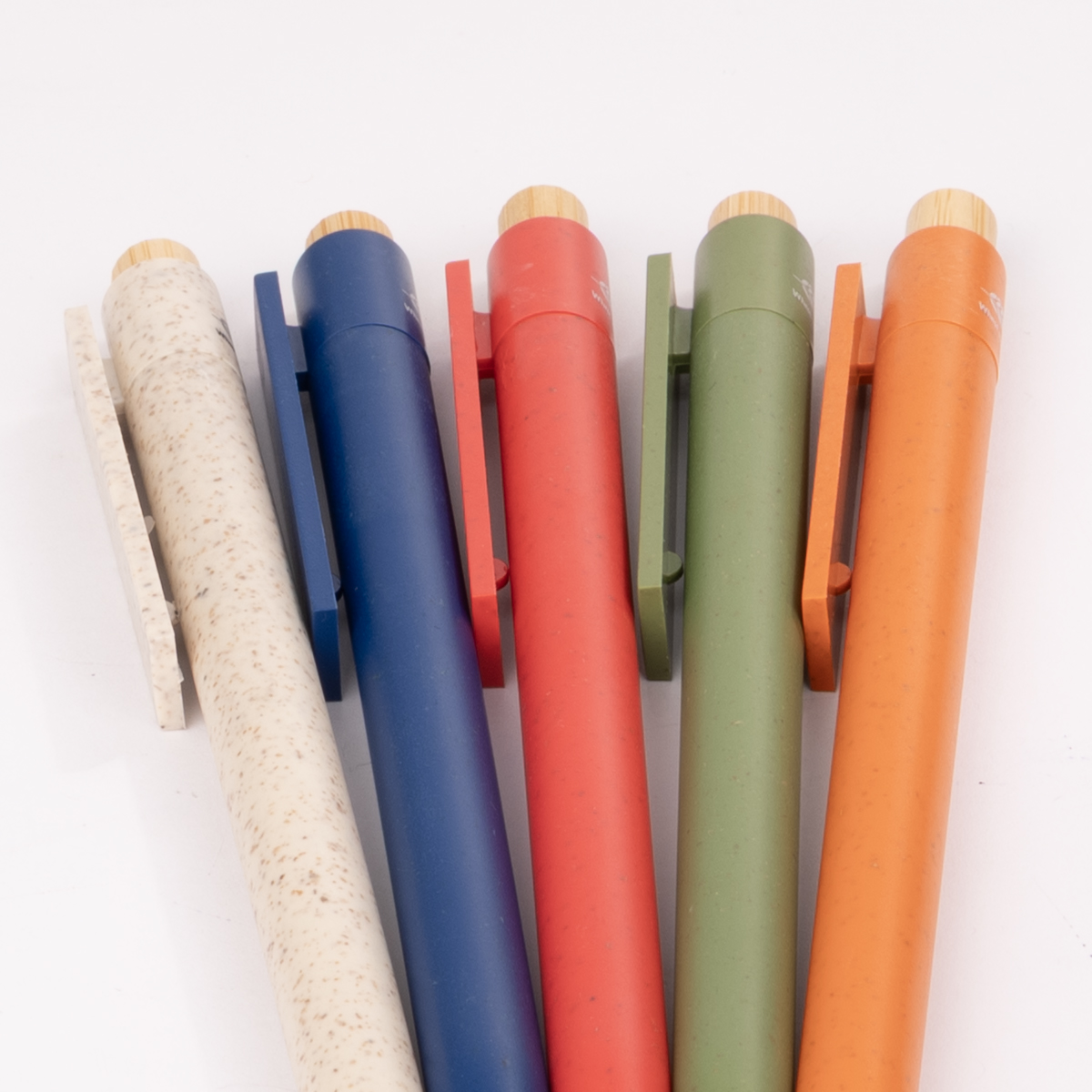Bolígrafo retráctil BOMBAY. Tamaño: 140x 10 mm Ø Material: Bambu, Fibra de Trigo Color: GR – Green (Verde), OR – Orange (Naranjo), RB – Royal Blue (Azul), RD – Red (Rojo), WH – White (Blanco) Certificado: FSC, RCS Empaque: 58 x 33 x 16,5 cm. – 9 Kg. – 1000 Unid/Caja Técnica Sugerida: Grabado Laser, Serigrafia