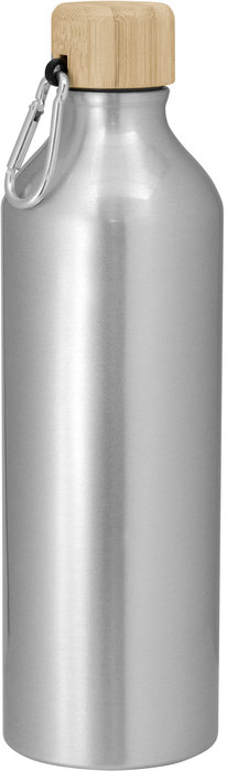 Botella de aluminio. Tapa a rosca de bambu con anillo de silicona y con mosquetón (gancho carabinero) en color plateado. Medidas: Ø 7,2 x 25,5 cm. Capacidad: 750 ml. Materiales: Aluminio y bambú. Color: Plata