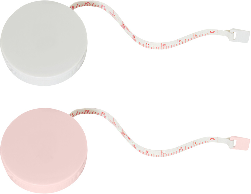 Huincha . De Ø 5 cm. huincha métrica de 1,5 m. Plástico, con botón de bloqueo que permite marcar medida y liberar cinta. Escala de medida en cm y pulgadas. Colores: Blanco, Rosa.