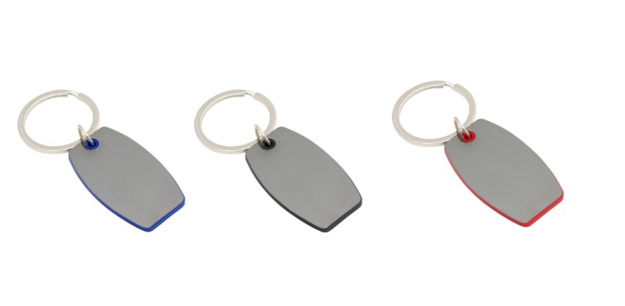 Llavero BORD. Llavero con forma ovalada. Estructura plástica de color con apliques de acero color gris gun de cada lado. Acabado brillante. Medidas: 5 x 3 x 0,35 cm. LLavero de Ø 3,5 cm x 0,2 cm. Colores: Negro, Rojo, Azul.