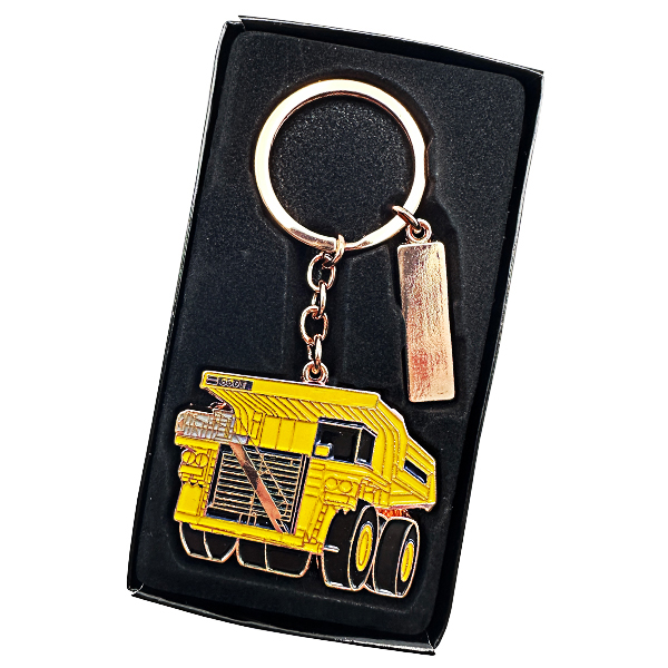 Llavero Camión Minero metálico electro plateado en color cobre. Tamaño 51 x 38 x 2.5 mm. Tamaño placa: 13.3 x 30,5 mm.