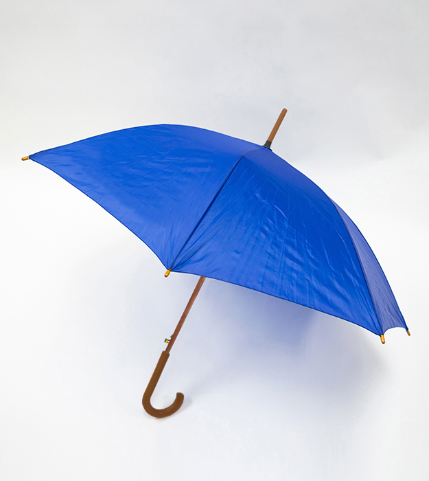 Paraguas, sistema de apertura automático con mango de madera barnizada. 8 cascos. Tamaño: 60 Cm. Color azulino. Incluye forro protector