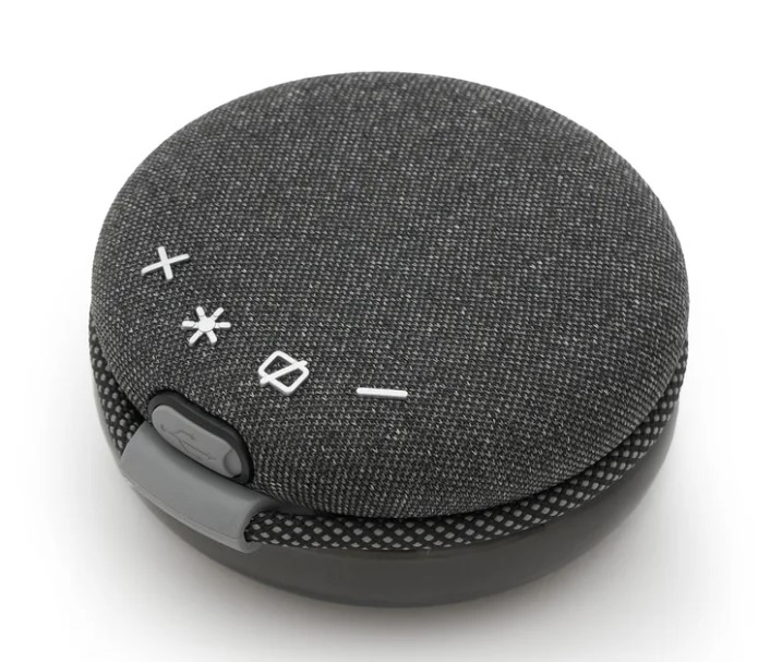 Parlante FULLMOON. Está fabricado en ABS y silicona, con un recubrimiento de tela. Su capacidad es de 1800 mAh. Altura:4.6 cm. Profundidad:10 cm. Ancho:10 cm