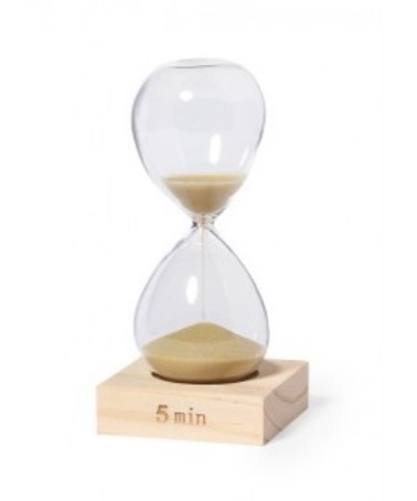 Reloj de arena de 5 minutos de duración. Fabricado en cristal de borosilicato, que ofrece una resistencia y durabilidad excepcionales, con base en madera de pino natural. Su elegante diseño y la arena en color natural lo convierten en un gadget decorativo y funcional, ideal para medir el tiempo. Presentado en una caja individual de diseño kraft. 5 Minutos