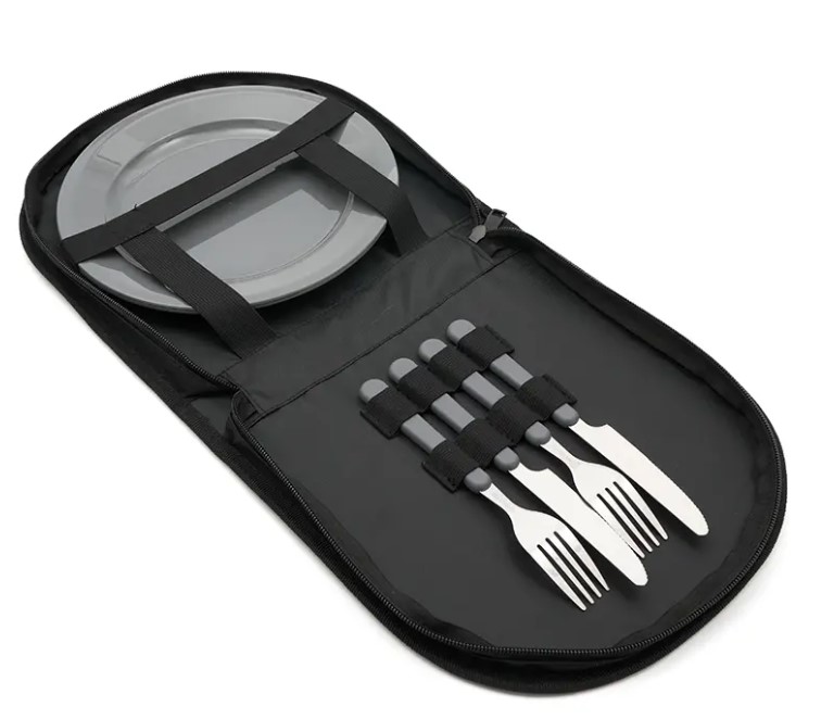 Set de Asado Andino Set de asado con funda organizadora compacta. Hecho en polycanvas de alta calidad, con detalles reforzados y cierre de cremallera resistente. Cuenta con bolsillo frontal, manija superior, espacio para 2 juegos de cubiertos y 2 platos, todo sujeto con bandas elásticas. Es ideal para llevar a picnics, campings o disfrutar un asado al aire libre.