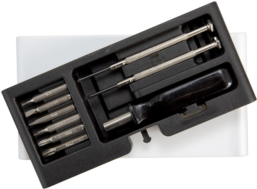 Set de destornilladores BOB. Set de destornilladores. Incluye: 1 mango con punta imantada, 6 puntas diferentes (3 planas: 1,5 ; 3 y 4 mm. y 3 cruz: 0000, 0 y 1mm.) y 2 destornilladores de precisión (1 plano y 1 cruz). Base imantada que permite mantener ordenadas las diferentes puntas. Apertura push. Medidas: 7,3 x 13,7 x 2,1 cm