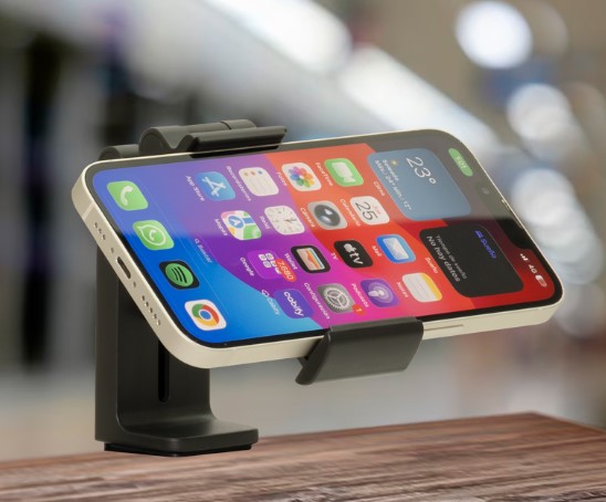Soporte Porta-Celular con sistema de sujeción a cubierta de hasta 4cm de grosor. Giro 360° hacia arriba/abajo y hacia los costados. Sujeción de celular retráctil hasta 9cm. Presentación en bolsa pp + caja de regalo impresa a todo color.